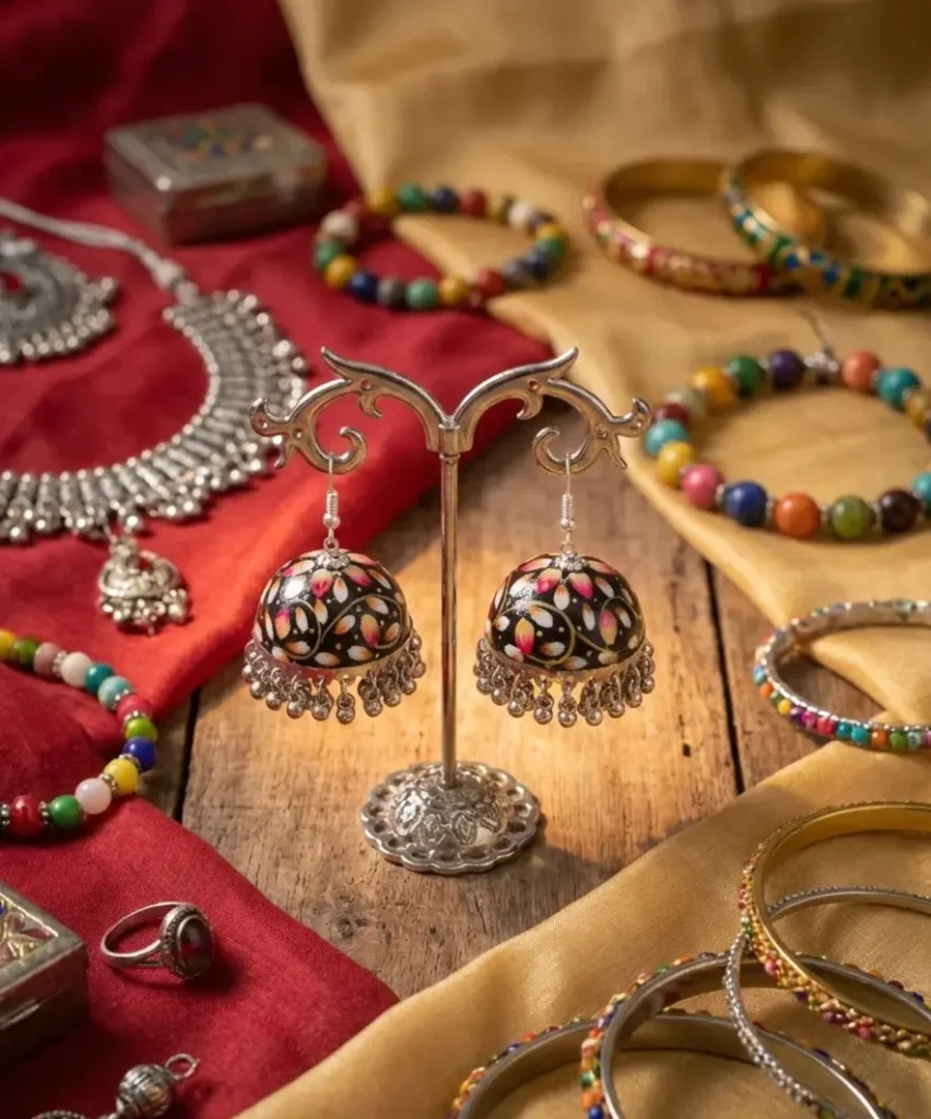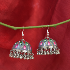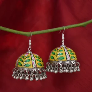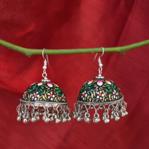 Elevate your ethnic wardrobe with our exquisite Hand-Painted Meenakari-Style Jhumkas. Crafted from lightweight metal and finished with intricate floral and botanical motifs, these earrings are hand-detailed by skilled artisans. The vibrant colours and delicate brushwork reflect the rich heritage of Indian folk art, making them a perfect gift or a standout addition to your own jewellery box.