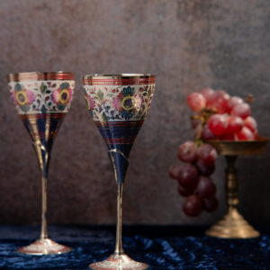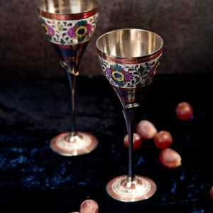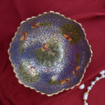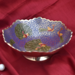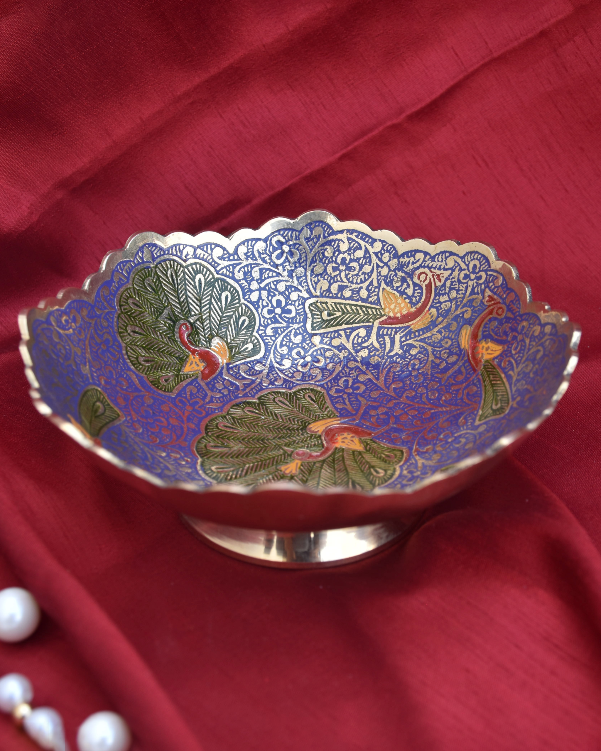 Handcrafted brass bowl features intricate carvings and vibrant hand-painted floral and paisley motifs. With its scalloped edges and rich metallic finish, it adds a touch of traditional artistry and festive charm to any space.
