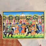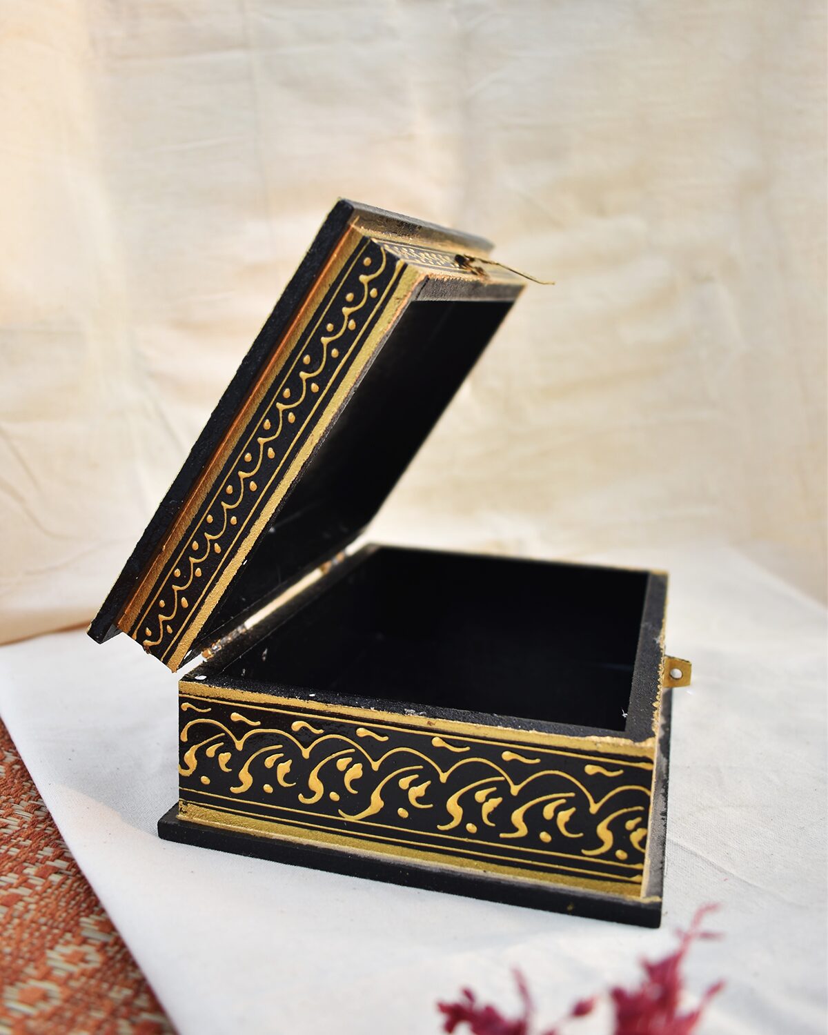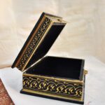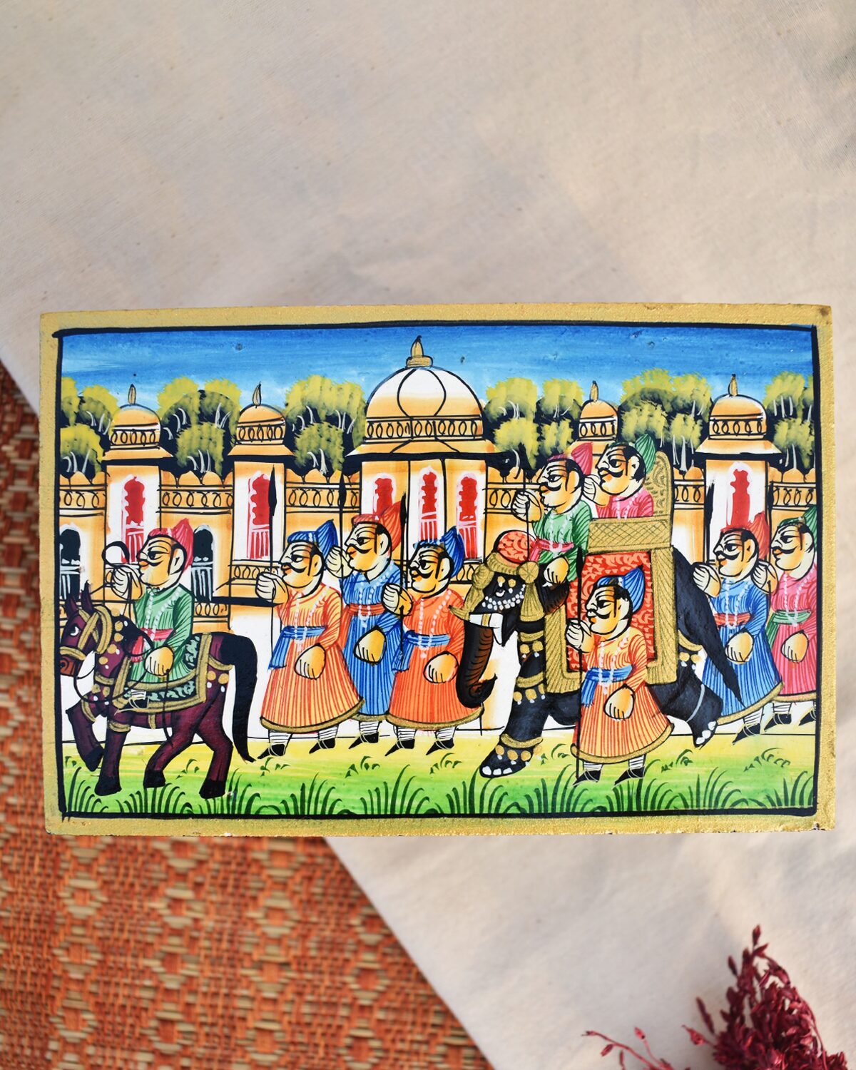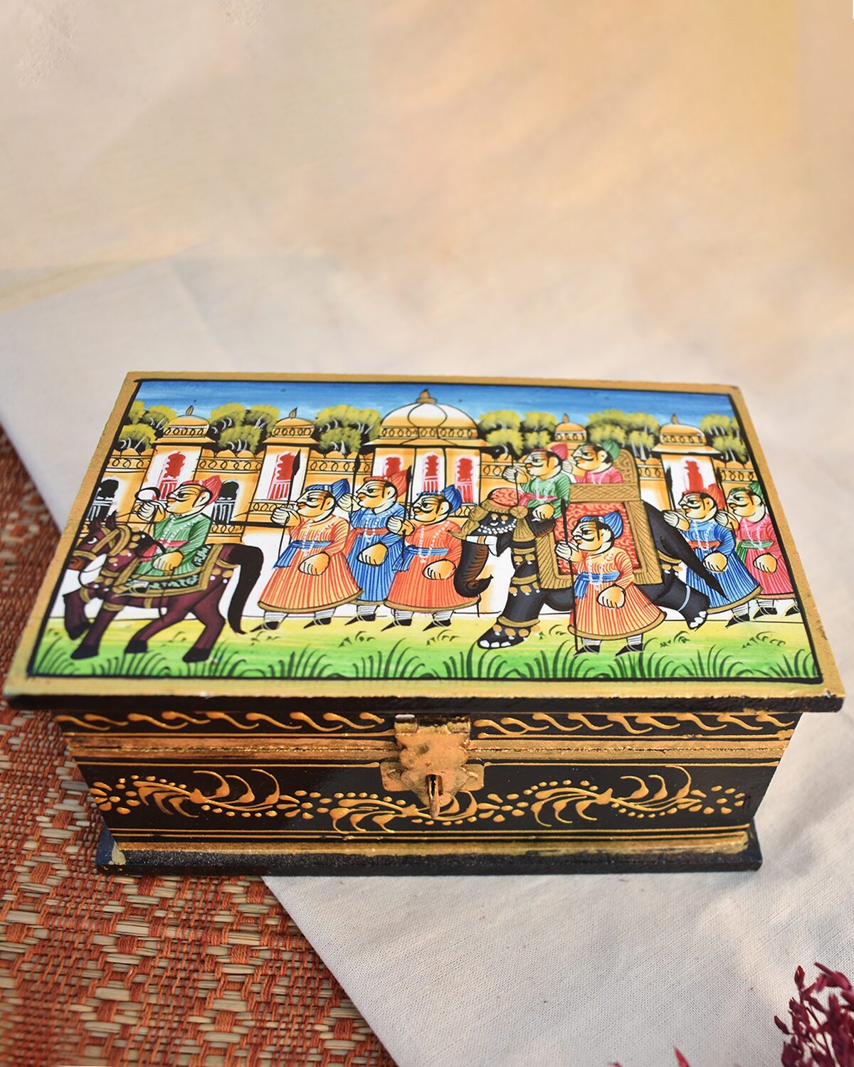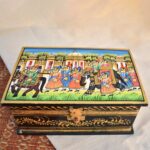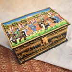 Celebrate the elegance of Indian artistry with this exquisite handcrafted wooden decorative box, adorned with a vibrant depiction of a royal procession. The lid features a hand-painted scene of regal splendour A spacious design that offers generous room for treasured items. Perfect as a statement piece or for organizing larger accessories along with a sturdy metal latch that secures the lid, making it ideal for storing jewellery, keepsakes, or gifting.