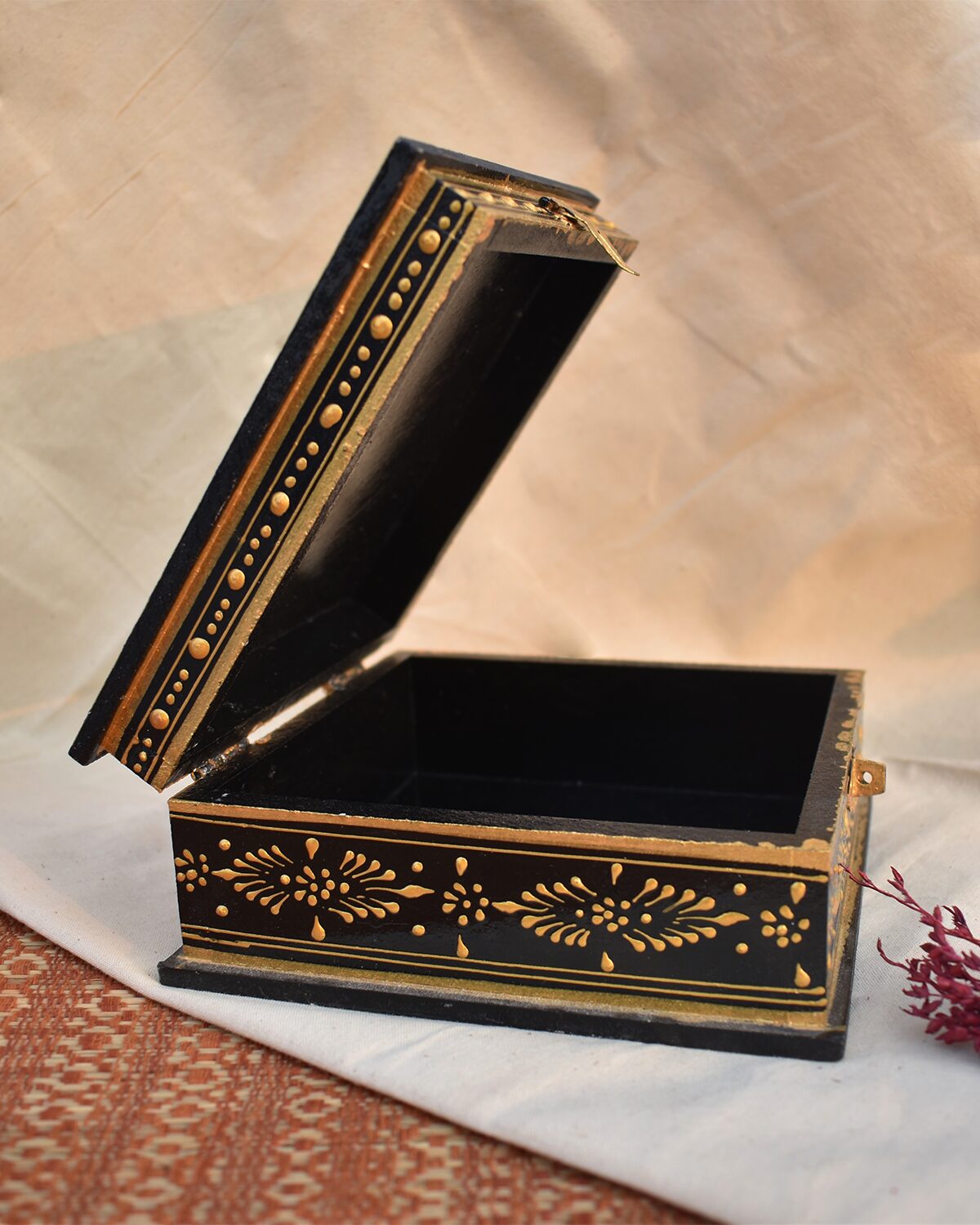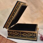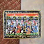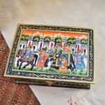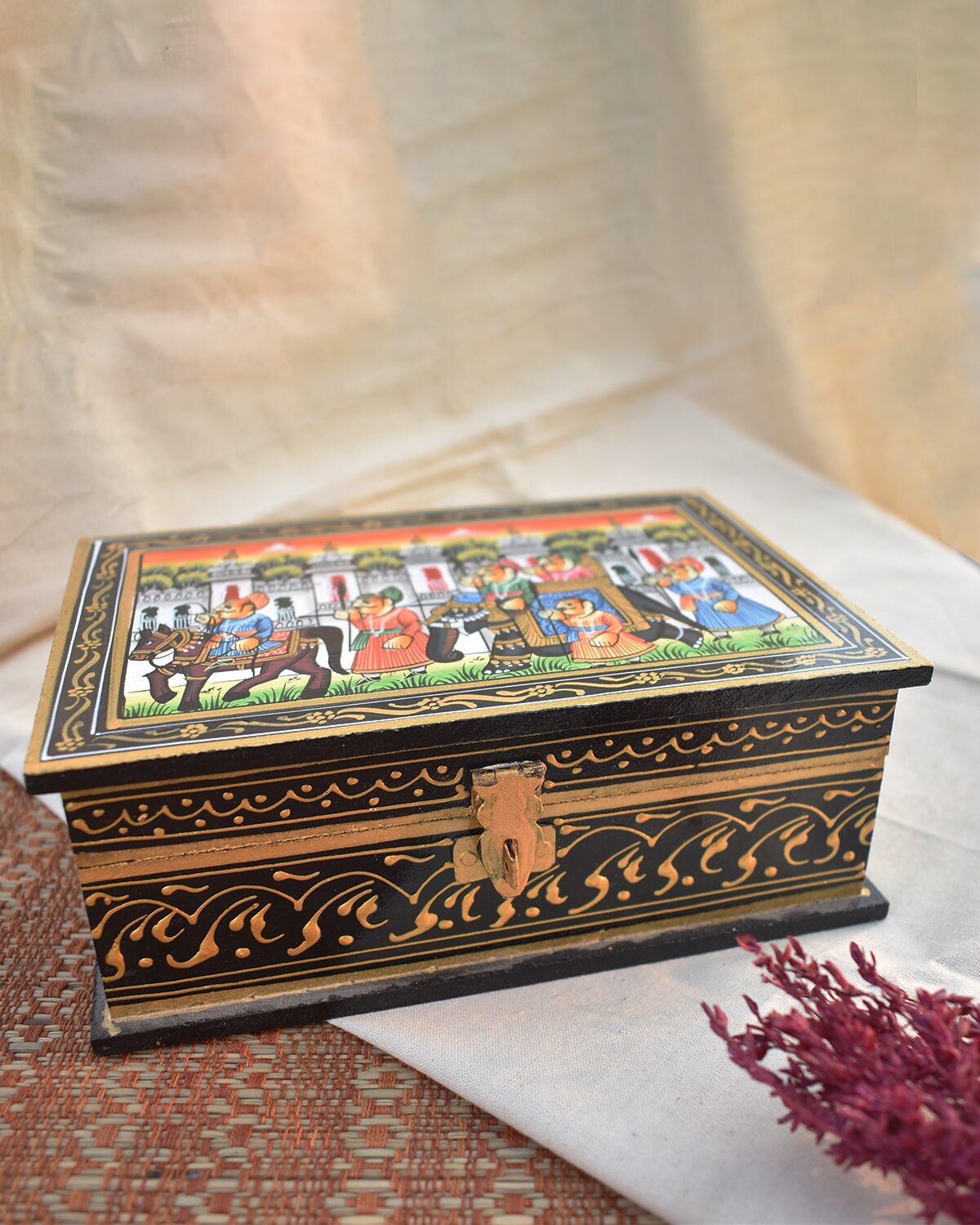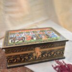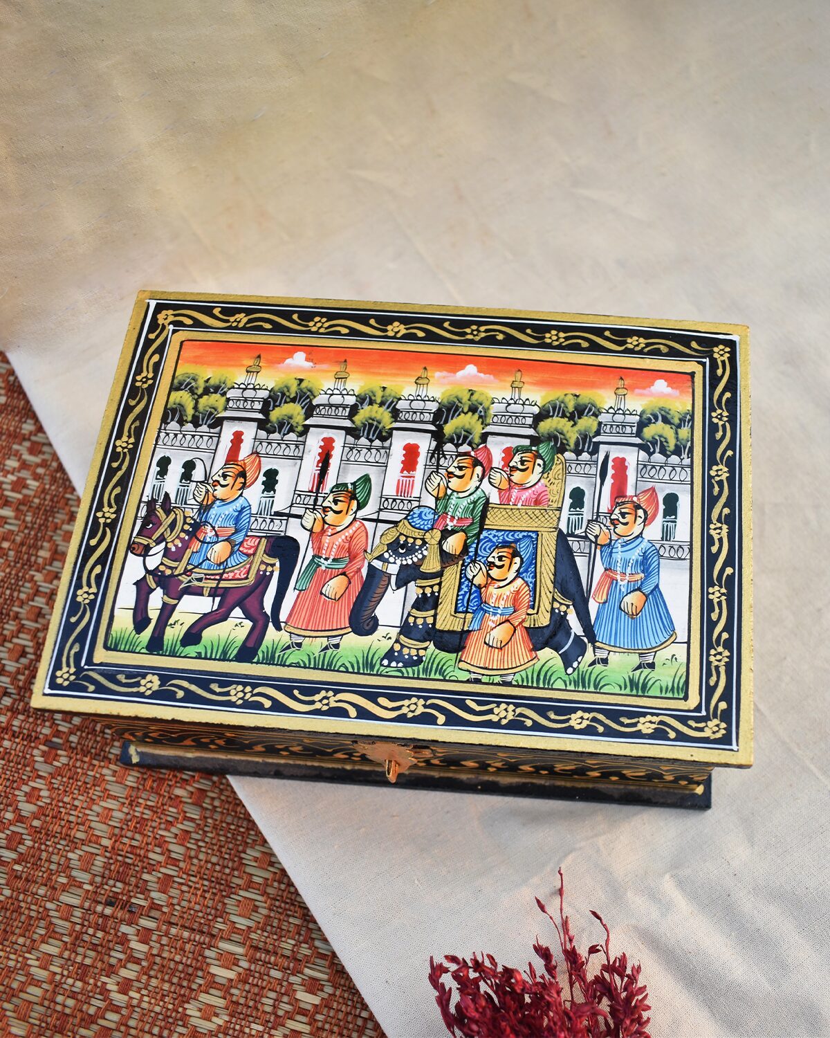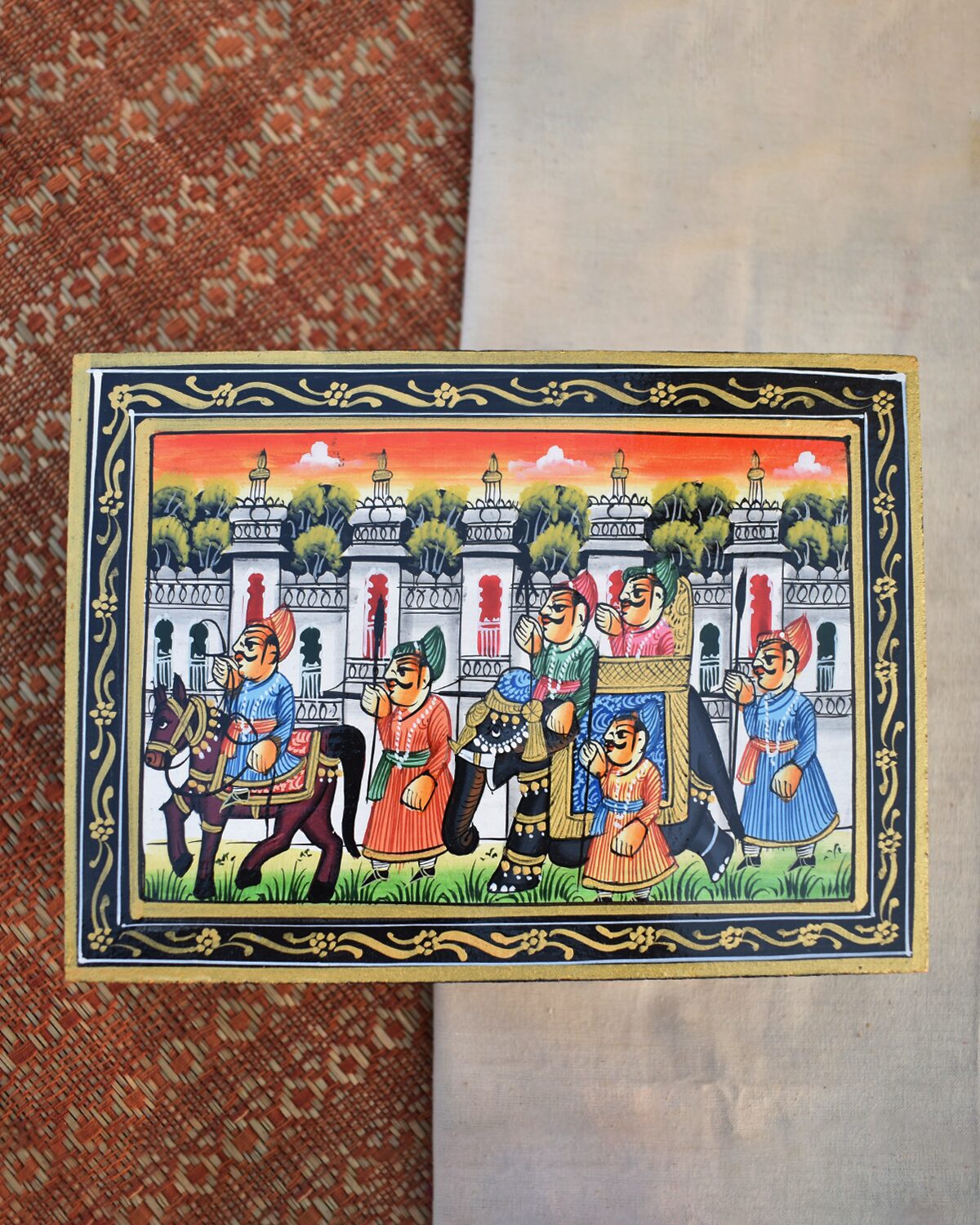 Celebrate the elegance of Indian artistry with this exquisite handcrafted wooden decorative box, adorned with a vibrant depiction of a royal procession. The lid features a hand-painted scene of regal splendour. This is a compact version ideal for storing small keepsakes along with a sturdy metal latch that secures the lid, making it ideal for storing jewellery, keepsakes, or gifting.