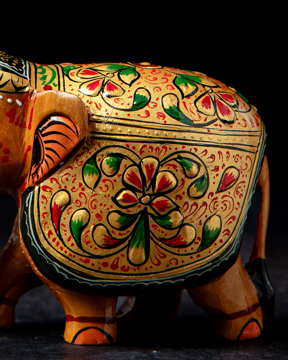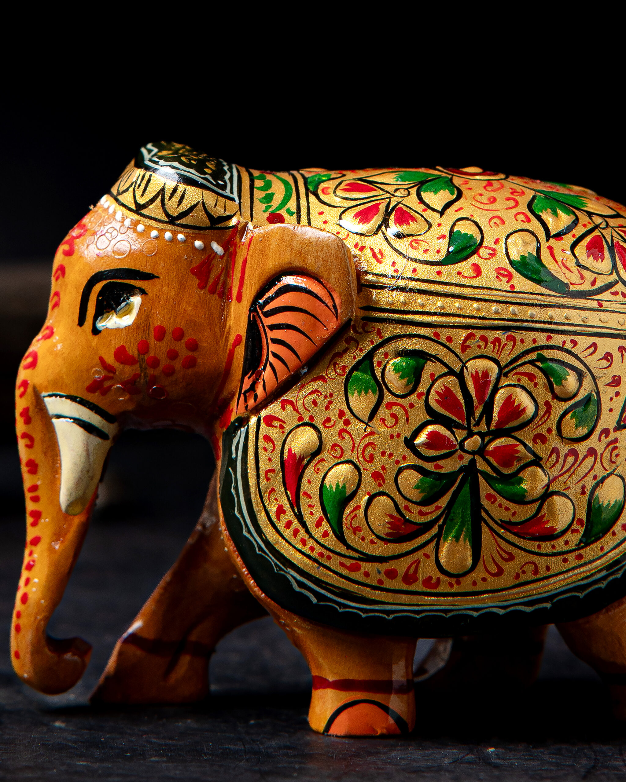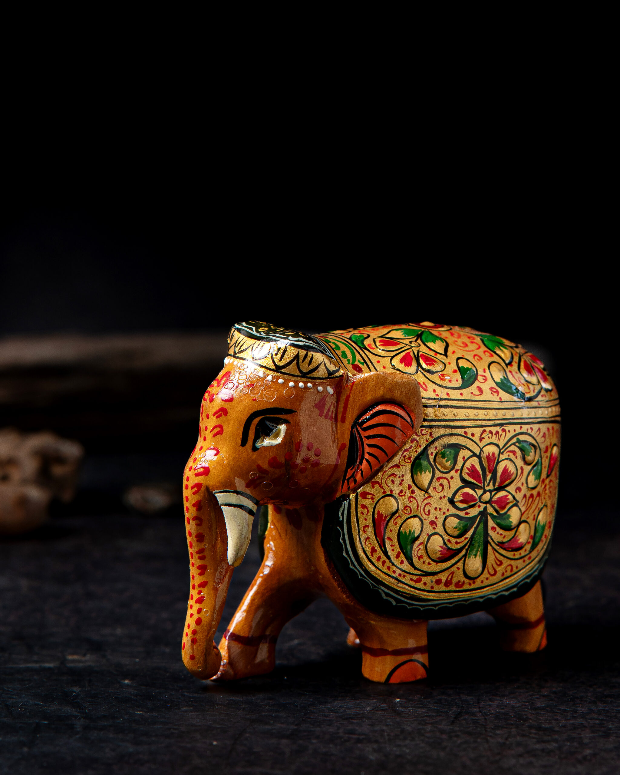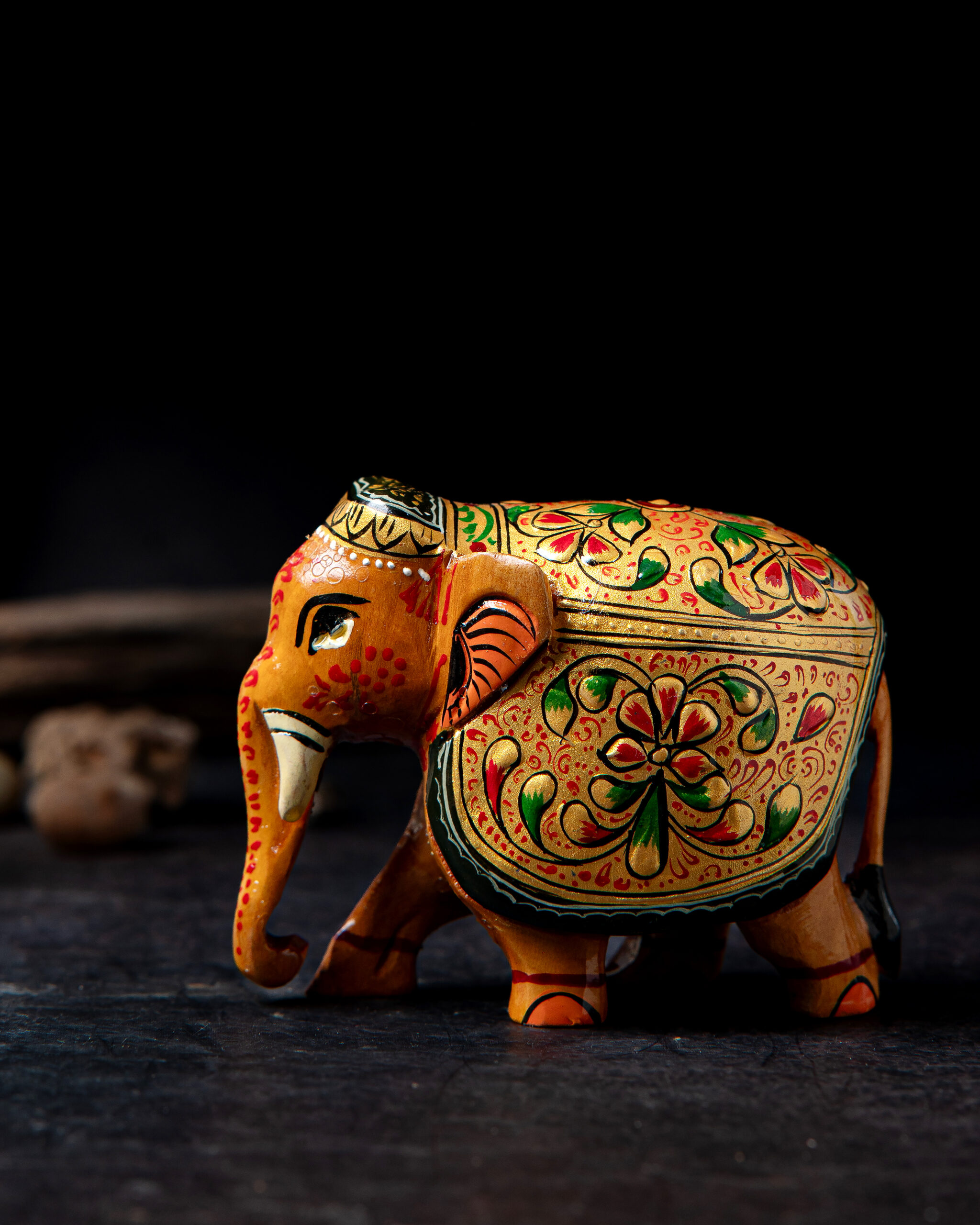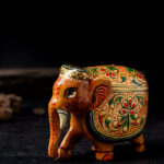 Bring a touch of heritage and artistry into your home with this beautifully embossed wooden elephant figurine. This piece is hand‑painted by skilled artisans, showcasing vibrant colours and intricate floral patterns. The elephant is decorated with a traditional Ambari style, featuring a rich gold base on its back. Surface is adorned with hand-painted Meenakari detailing that highlights India’s rich decorative traditions. The embossed patterns add depth and texture, while the elephant itself symbolizes wisdom, strength, and prosperity.