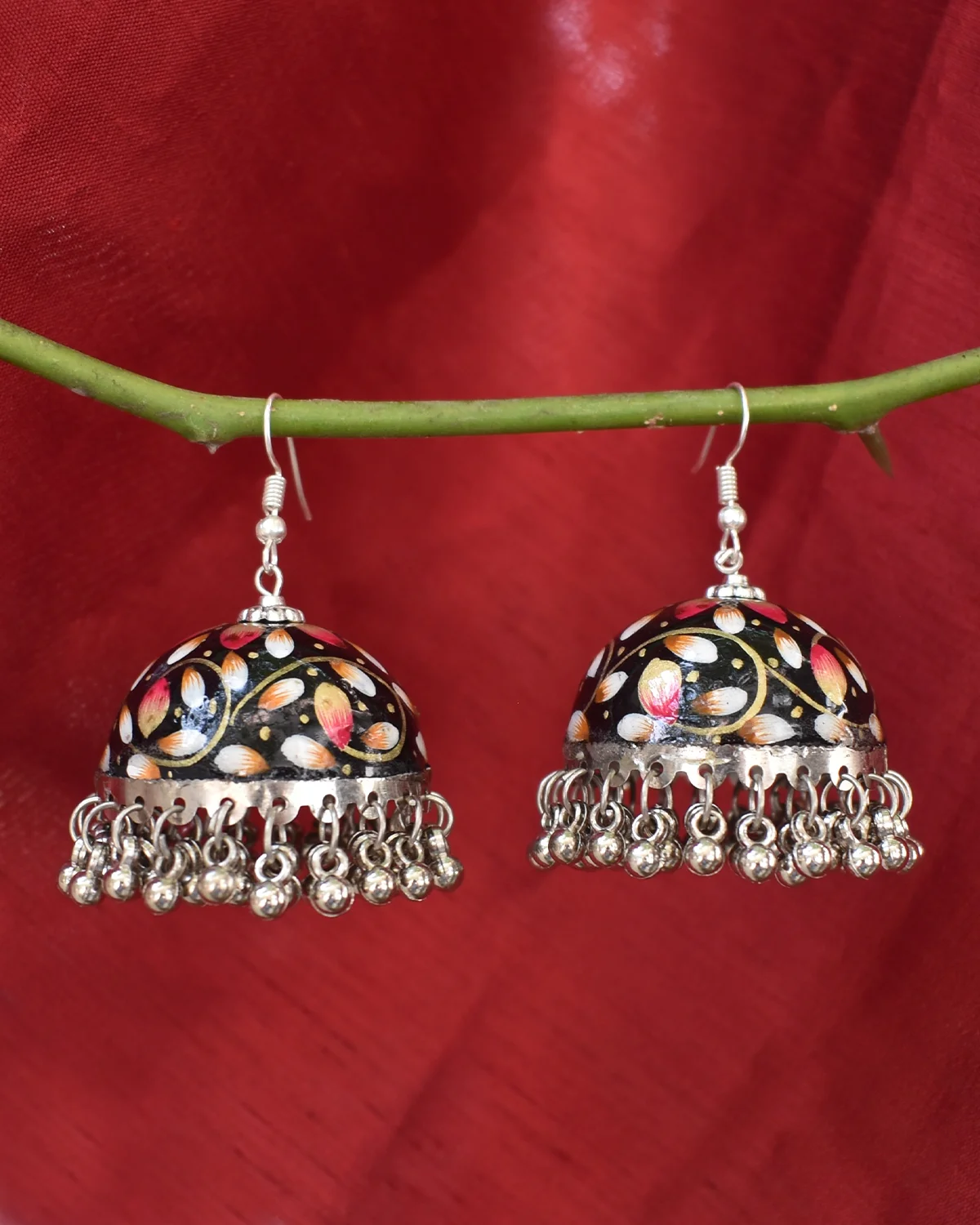 Elevate your ethnic wardrobe with our exquisite Hand-Painted Meenakari-Style Jhumkas. Crafted from lightweight metal and finished with intricate floral and botanical motifs, these earrings are hand-detailed by skilled artisans. The vibrant colours and delicate brushwork reflect the rich heritage of Indian folk art, making them a perfect gift or a standout addition to your own jewellery box.