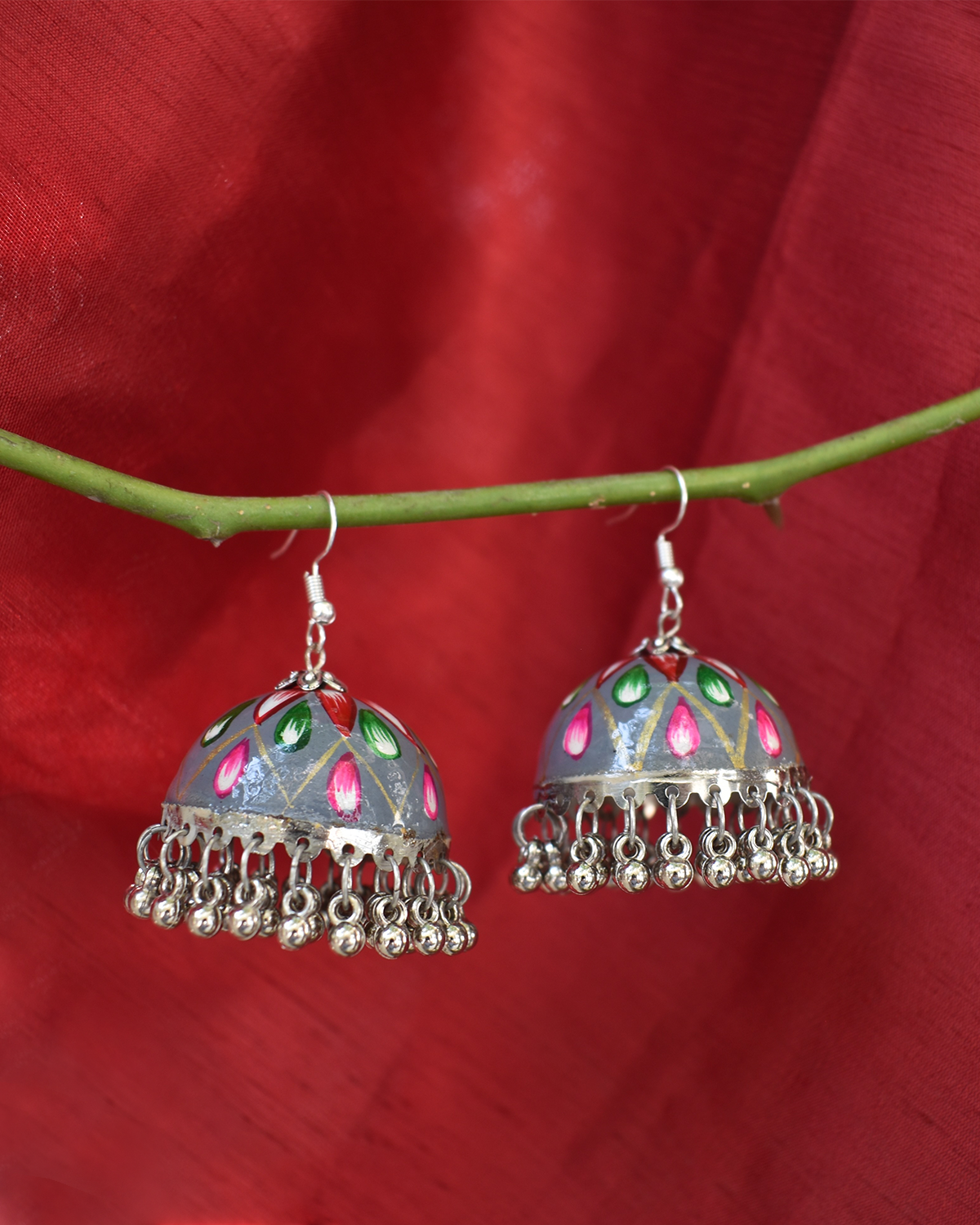 Elevate your ethnic wardrobe with our exquisite Hand-Painted Meenakari-Style Jhumkas. Crafted from lightweight metal and finished with intricate floral and botanical motifs, these earrings are hand-detailed by skilled artisans. The vibrant colours and delicate brushwork reflect the rich heritage of Indian folk art, making them a perfect gift or a standout addition to your own jewellery box.